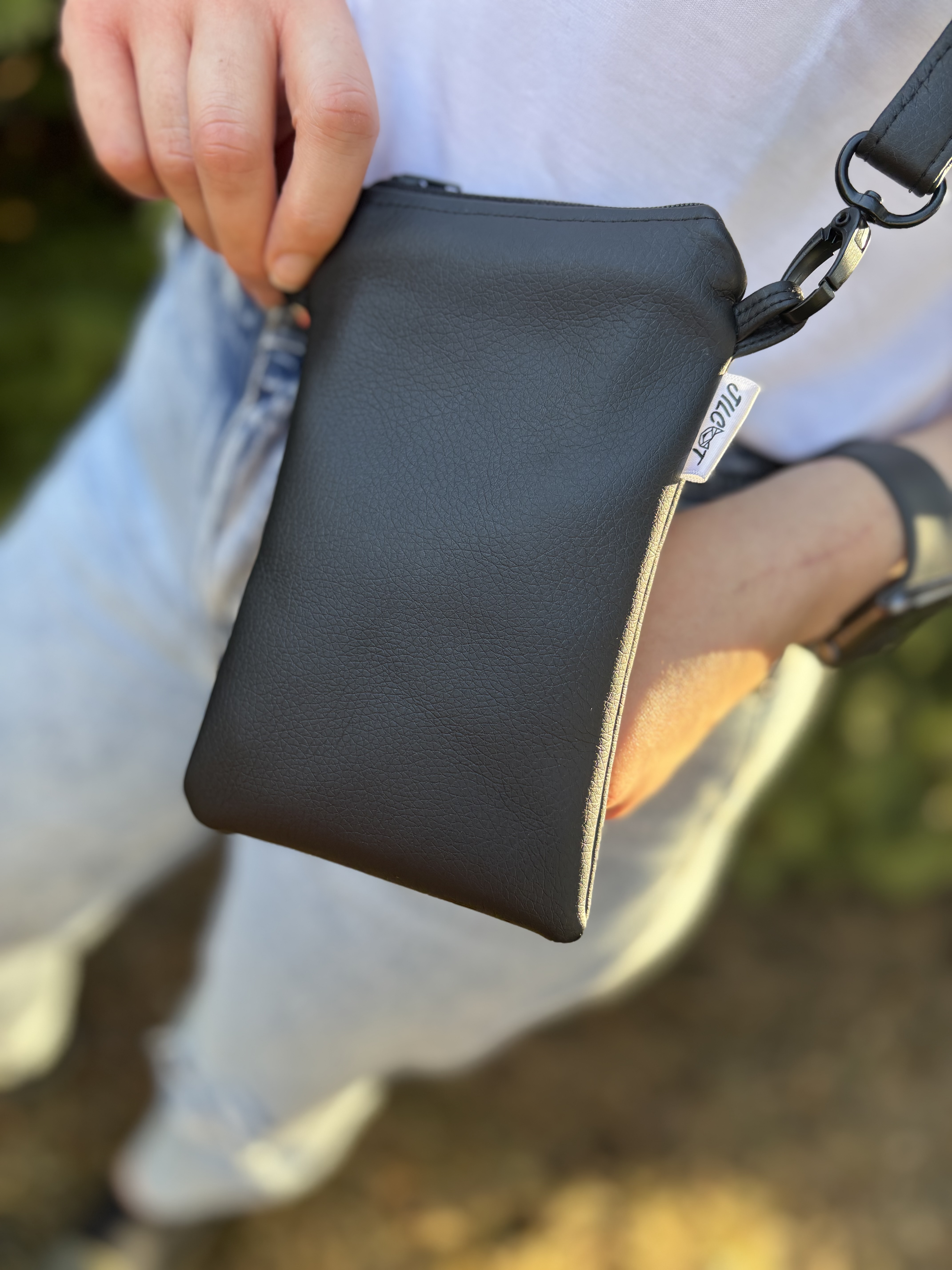 Crossbody na mobil (černá s koženkovým popruhem)