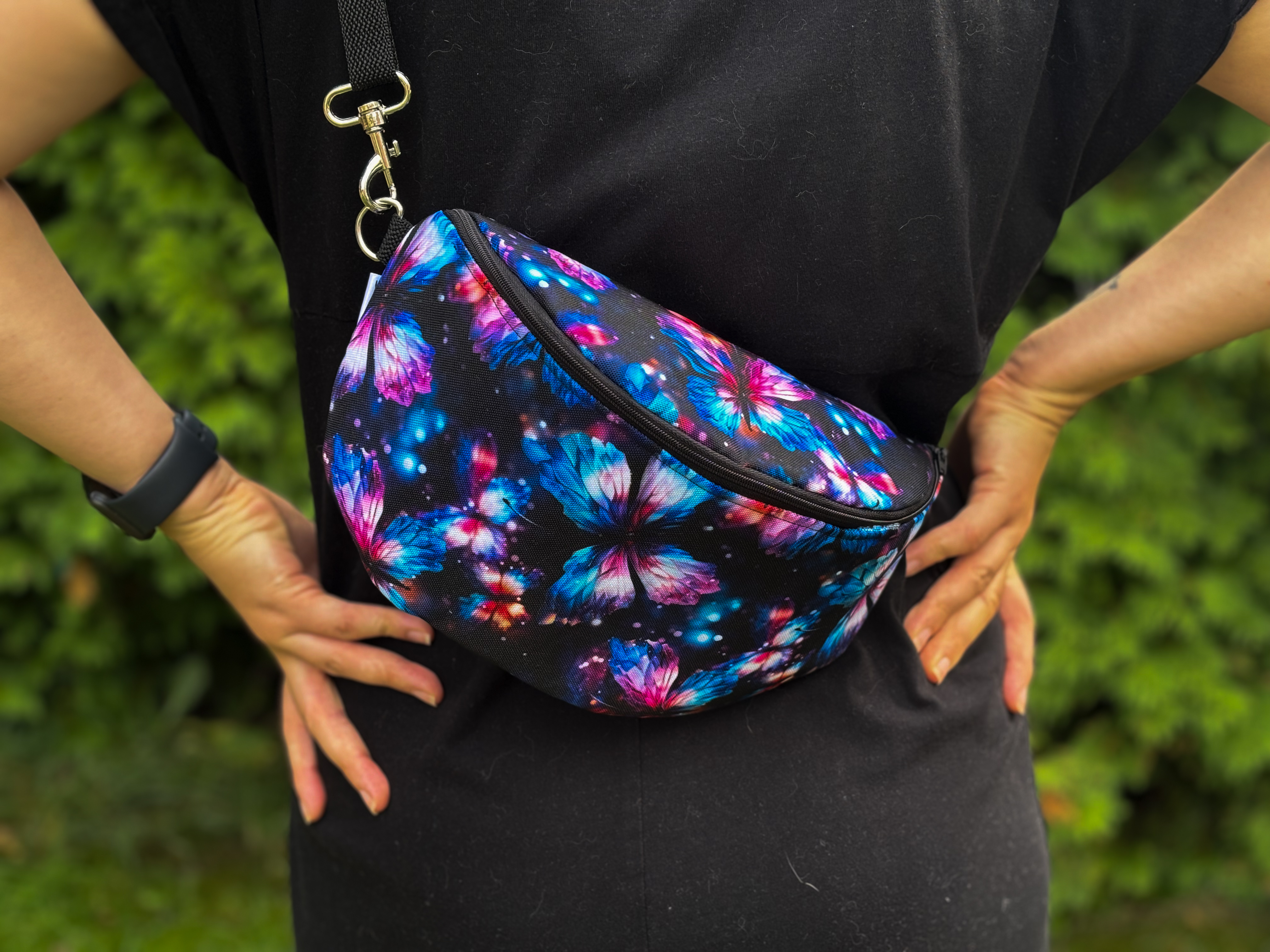 Ledvinka o velikosti 27 x 18 cm, vejde se do ní vše potřebné. Uvnitř je samozřejmě malá kapsička, do které si můžete dát mobil. Zapínání na zip. Popruh odnímatelný a nastavitelný. Ušito z nepromokavé látky z vnější části, vnitřní část bavlna, ledvinka je navíc celá vyztužená a díky tomu krásně drží tvar.